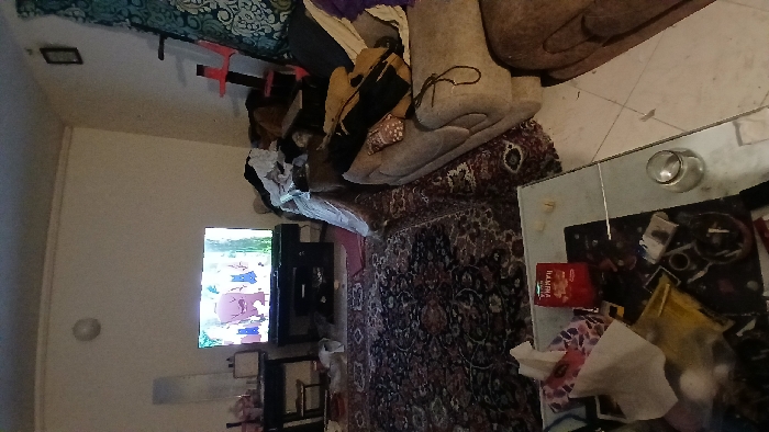 The interior displays a cluttered scene with a TV screen showing a cartoon. An ornate rug covers the floor, and a couch sits atop it, partially obscured by footwear. A table laden with various items, including a jar and a box of Hamtha, is visible. The room seems lived-in, with personal belongings scattered around, creating a sense of domesticity.