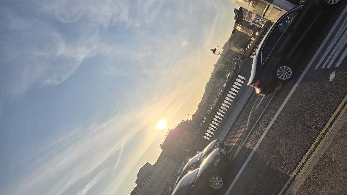 This image captures a sunlit urban landscape from a tilted perspective, likely during late afternoon or early morning, on Parnell Bridge in Cork, Ireland, looking towards the west. The upper approximately two-thirds of the frame consists of a bright blue sky adorned with scattered, wispy white cirrus clouds. The sky transitions to a warm yellow-orange tone near the horizon line. A prominent, intense circular sun, radiating significant glare, is positioned in the upper-left quadrant of the sky. The lower portion of the image displays the asphalt surface of a roadway on a bridge. The road is marked with white solid and dashed lane lines, and a double yellow line runs along the bottom-left edge. A white pedestrian crosswalk pattern is partially visible in the lower-right. Two dark-colored sedans are present on the roadway; one is in the lower-left foreground, partially visible from the front, and the other is in the middle-right, showing its rear and right side. Both vehicles reflect the strong sunlight, creating bright highlights. No individuals are discernible within or around the vehicles. A decorative white balustrade bridge railing runs horizontally across the mid-ground, separating the roadway from the body of water (River Lee) below, which is not directly visible. The low-angle sunlight casts long, distinct shadows of the balusters onto the area beyond the railing. Beyond the bridge railing and implied river, a row of multi-story buildings with traditional architectural styles lines the distant bank. These structures are illuminated by the sun, causing their facades to glow. Faint outlines of distant hills or elevated terrain are visible against the horizon behind these buildings.