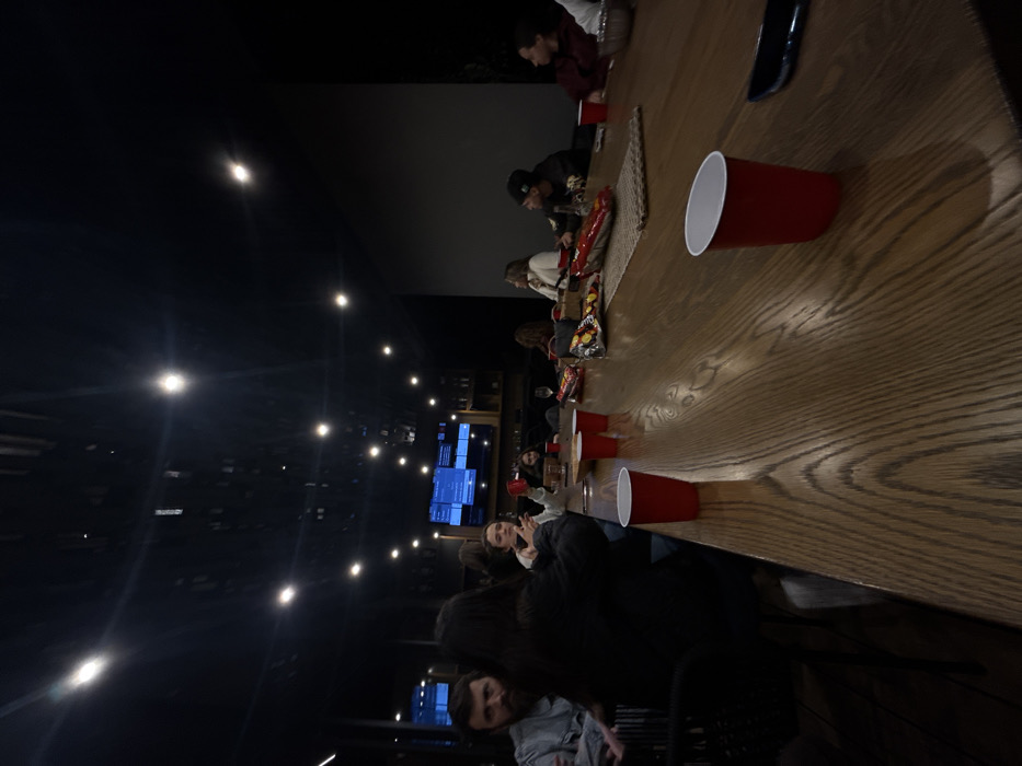 A group of people sit around a long wooden table. Several red plastic cups are placed along the table's length, some empty and some apparently filled with liquid. A few bags of chips and a small mat are on the table. People are talking and socializing. Overhead, a row of lights illuminates the scene. A television screen is visible in the background.