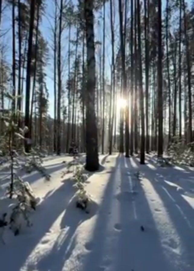 The video depicts a snow-covered forest with tall trees, shadows stretching across the snow, and sunlight streaming through the trees