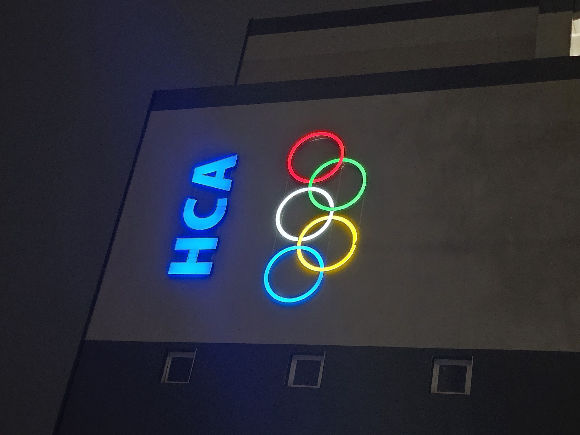 The image depicts a section of a building facade at night in Sofia, Bulgaria, specifically the National Sports Academy "Vasil Levski" in Studentski Grad. The upper-right portion of the facade is light grey, while the left section is dark grey or dark blue. Prominently displayed on the light grey facade are two illuminated signs. The upper sign consists of three blue neon capital letters, spelling "HCA." Directly below "HCA" are five interlocked neon rings, representing the Olympic symbol. From left to right, these rings are illuminated in blue, yellow, white, green, and red. Three small, square, unlit windows are visible on the darker left section of the building. The sky is dark, indicating nighttime conditions. No people or specific actions are visible.