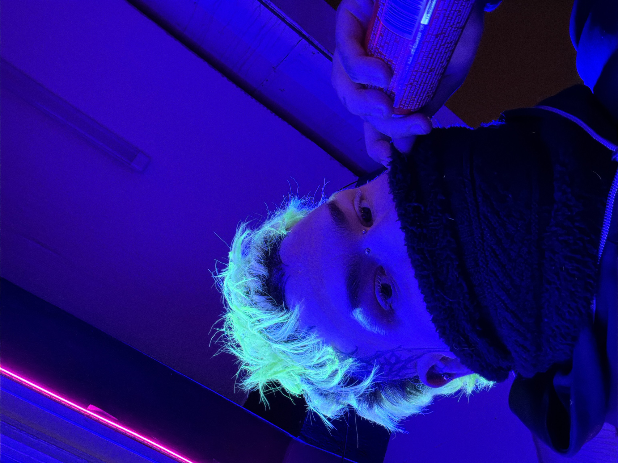 A low-angle close-up depicts an individual in an indoor setting in Ushuaia, Argentina. The person has spiky, neon green hair and a visible eyebrow piercing. The lower half of their face is obscured by a black, textured neck warmer pulled up to the nose. A tattoo is discernible near the left temple. The individual holds a red and white branded can in their right hand. The environment is characterized by predominant blue and purple neon lighting, with a distinct pink neon strip light visible in the upper left background and fluorescent tube fixtures on the ceiling. Architectural surfaces of the interior reflect the intense artificial light.