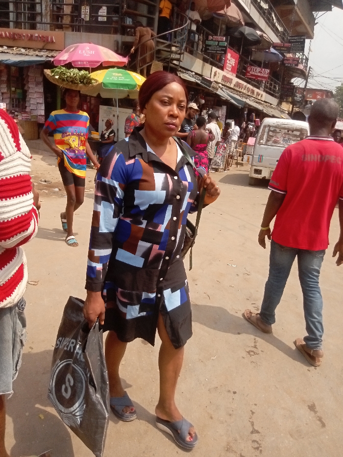 This image captures a busy street scene in Fegge, Nigeria, depicting pedestrian activity and a commercial environment during daylight hours. In the foreground, a woman with auburn hair, wearing a black collared dress patterned with blue, white, and brown geometric shapes, walks towards the left of the frame. She wears grey slip-on sandals with red nail polish visible on her toes and carries a large black shopping bag with white text and an 'S' logo in her left hand. A dark shoulder bag strap is visible over her right shoulder. She looks directly towards the viewer with a neutral expression. To the immediate left, the partial view of another person shows a white and red striped garment over grey shorts. Further back and slightly to the left, a young person wearing a colorful striped t-shirt and dark shorts walks away from the camera, balancing a wide, shallow basket filled with green produce on their head. They wear light blue and white flip-flops. In the mid-ground to the right, a man in a red polo shirt with white trim and blue jeans walks away from the camera. He wears brown slip-on shoes and a gold-colored wristband on his left wrist. Behind him, a white commercial van or similar vehicle is visible. The background features multi-story commercial buildings characteristic of a market or business district. Numerous small shops and stalls line the street, some with awnings and displays of goods. A pink umbrella with "LUSH" visible and a green umbrella provide shade for vendors. Many other pedestrians are visible throughout the scene, suggesting a densely populated area with active commerce. Overhead, electrical wires are strung between buildings. The ground is an unpaved or poorly maintained dirt and gravel surface with visible tire tracks and footprints. Shadows indicate bright sunlight.