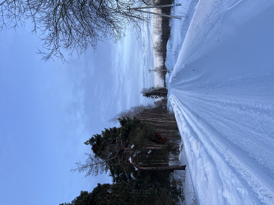 A snow-covered road stretches between wooded areas under a cloudy, pale blue sky