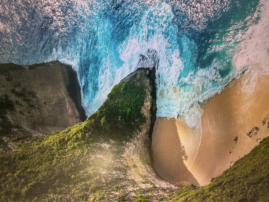 An aerial or elevated view depicts a dramatic coastal landscape, located in the city of Madrid, Spain. The scene features steep, rugged rock cliffs covered with dense green vegetation on the left and upper portions, leading down to a crescent-shaped sandy beach at the bottom center. The ocean, exhibiting vibrant turquoise and deep blue hues, features significant white foamy waves actively crashing against the sandy shore and the bases of the cliffs. No people, animals, or man-made structures are visible in the frame. The environment is dominated by natural geological formations and dynamic ocean water.