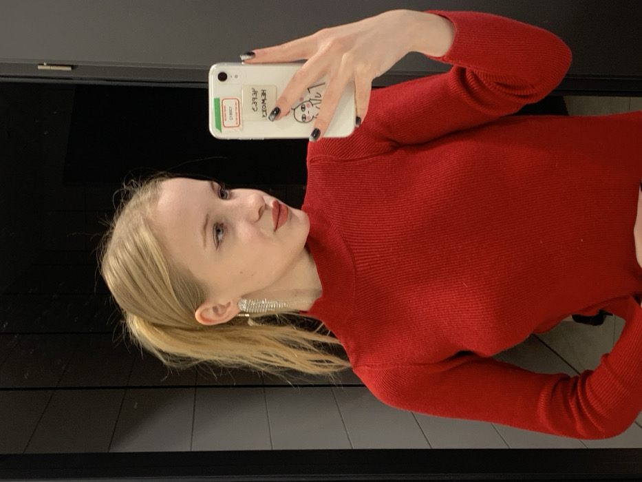 A young female subject with light skin and blonde hair styled in a high ponytail is captured in a mirror selfie