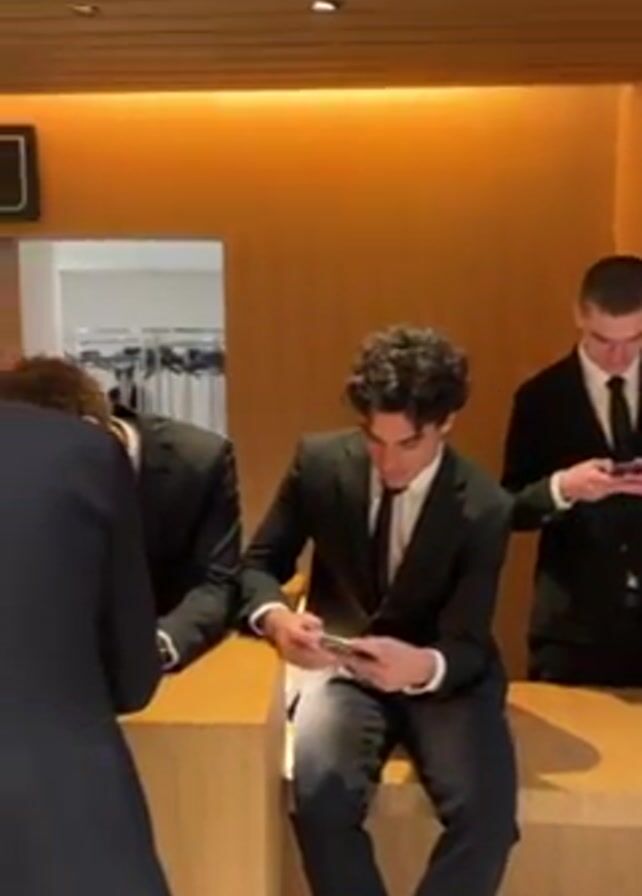 several men dressed in suits, standing and sitting at a reception desk while looking at their phones. The environment appears to be a large, modern lobby with light wood paneling, a stone floor, and a ceiling with decorative wood slats. The men interact minimally, focused on their devices. The camera then pans to give a wide view of the lobby, revealing its spaciousness and minimal occupancy.