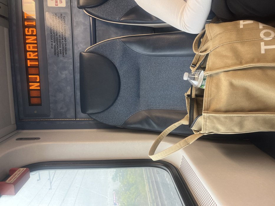 An interior view of an NJ Transit train car depicts a journey in Harrison, United States. The image is taken from a passenger's perspective, looking towards the front of the train and out a window. In the immediate foreground, a light tan canvas tote bag, featuring dark zipper closures, sits on a seat. A clear plastic water bottle with a white cap is positioned upright inside the bag. To the right, the arm and shoulder of a person, wearing a long-sleeved light-colored garment and dark lower attire, are partially visible, occupying an adjacent seat. Directly ahead, an empty train seat is presented, characterized by a dark blue-black leather headrest and armrests, complemented by a textured grey-blue fabric for the back and cushion. Above these seats, an amber LED display clearly shows the text "NJ TRANSIT." Below the display, a white warning sticker with black text states, "IT IS A VIOLATION OF FEDERAL REGULATIONS FOR AN UNAUTHORIZED PERSON TO OPEN SIDE DOORS OR TO CAUSE AN EMERGENCY BRAKE APPLICATION WHEN NO EMERGENCY EXISTS." A red "EMERGENCY EXIT" sign is partially visible on the upper left window frame. Through the window on the left, an exterior scene is visible, appearing overcast with rain droplets on the glass. Parallel train tracks run alongside the train, with green foliage and distant structures visible under a hazy sky. A metal ventilation grate is located beneath the window.