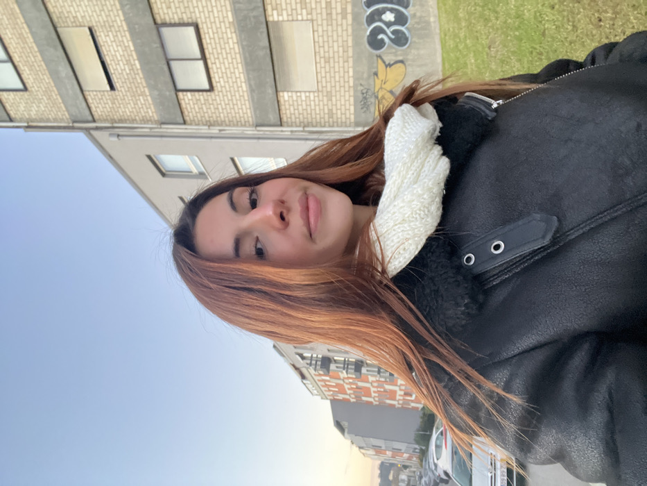 A young woman poses outdoors, her long reddish-brown hair cascading over a black leather jacket with a white knitted scarf at the collar. Buildings form the backdrop, one with brickwork and graffiti, the other showcasing a modern facade. The sky is visible in the background, with cars parked below.