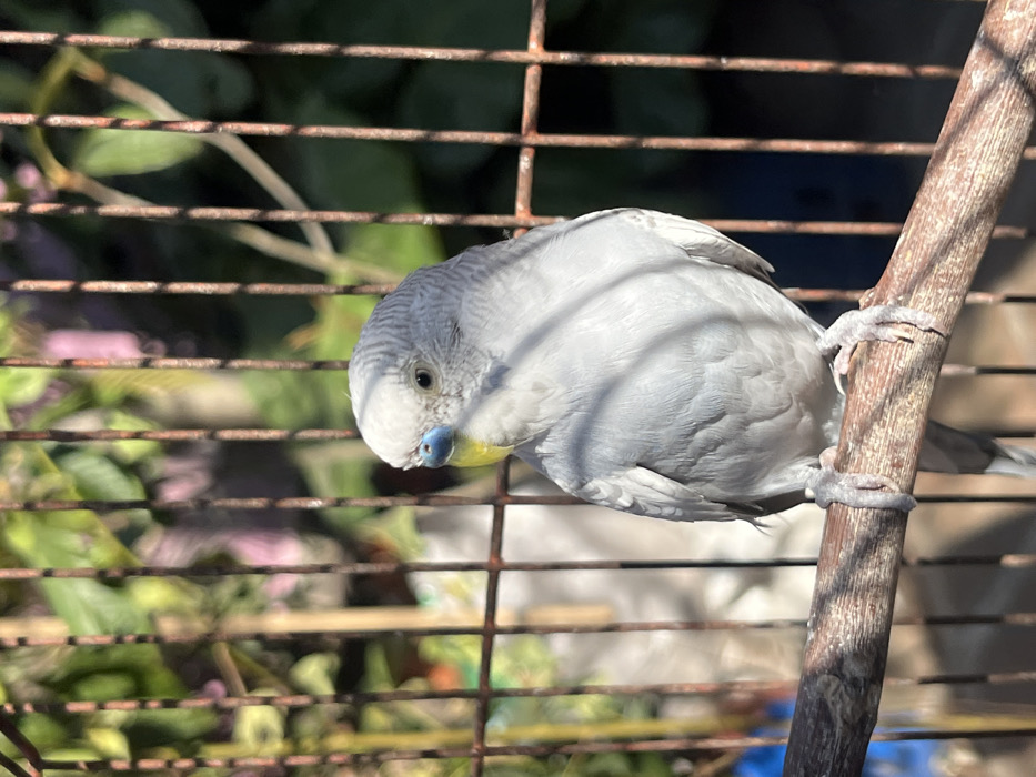 - "A gray and white budgie perches inside a cage, its head tilted downwards with a blue cere and a hint of yellow on its face" by FM-Wvo0J3, licensed under CC BY 4.0
