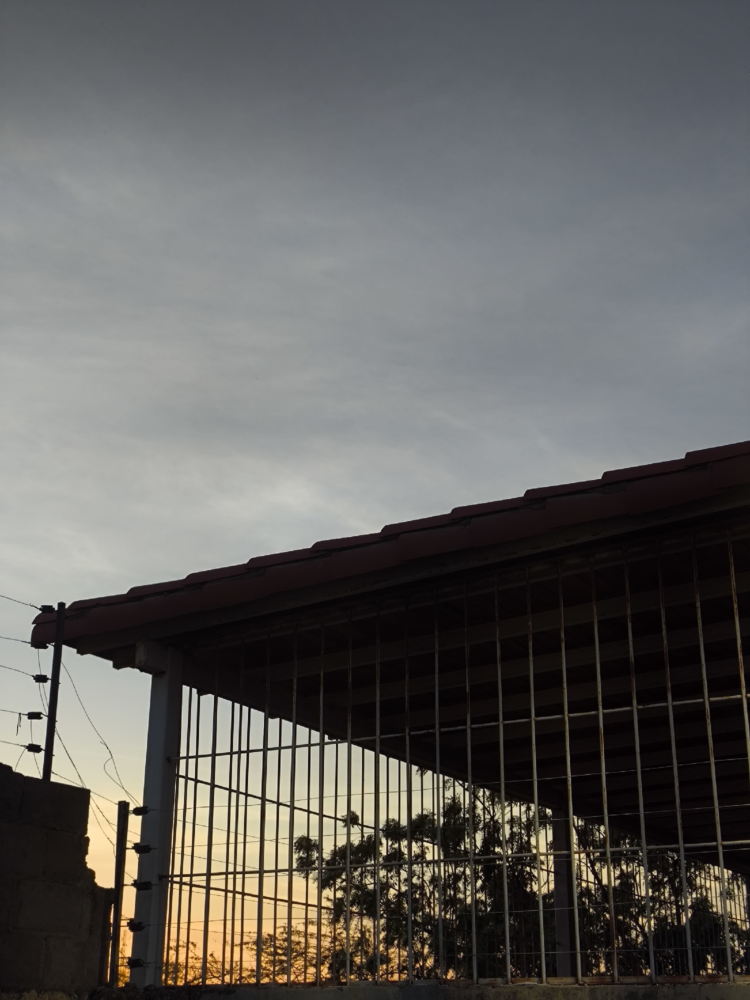 This image captures a low-angle view of a street scene in La Guardia, Venezuela, at either sunrise or sunset. The upper two-thirds of the frame are dominated by a sky displaying a gradient from a muted, light gray-blue with subtle cloud patterns at the zenith to a vibrant orange-yellow at the horizon. In the mid-ground, a dark reddish-brown tiled roof structure extends horizontally across the frame, silhouetted against the sky. Below the roof, a prominent metal security grille, composed of numerous closely spaced vertical bars supported by horizontal crossbars, is heavily shadowed. Through the bars of this grille, the dark silhouettes of multiple trees or tall shrubs are visible against the bright horizon. On the far left, a rough, unfinished block wall or pillar stands in shadow, with its top appearing somewhat eroded. Attached to this wall and extending upwards are multiple strands of electric fence wiring, secured by light-colored ceramic or plastic insulators mounted on dark posts. No people, specific actions, or direct interactions are visible. The overall environment suggests an outdoor setting with structural elements indicating property boundaries and security measures.