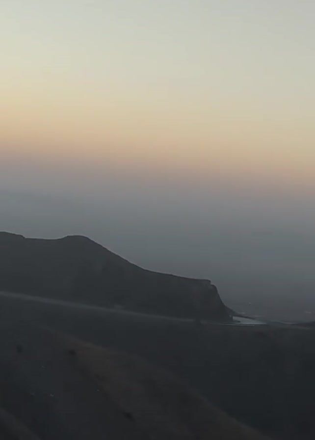 view from a vehicle driving on a mountain road. The first shot is a distant view of mountains silhouetted against a hazy sky at dawn or dusk. The camera angle then shifts to an inside view through the front windshield of the vehicle. A sticker with Arabic calligraphy is visible on the windshield. The vehicle is driving on a paved road with mountains in the background. The road is winding and has red and white safety barriers on the side. There is a crack on the windshield.
