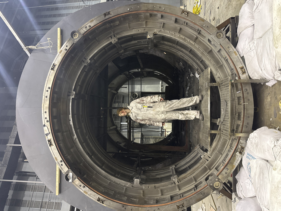A single individual stands centrally within the primary circular opening of a massive, dark grey, metallic structure located indoors at an industrial facility or film set in Huangdao District, China