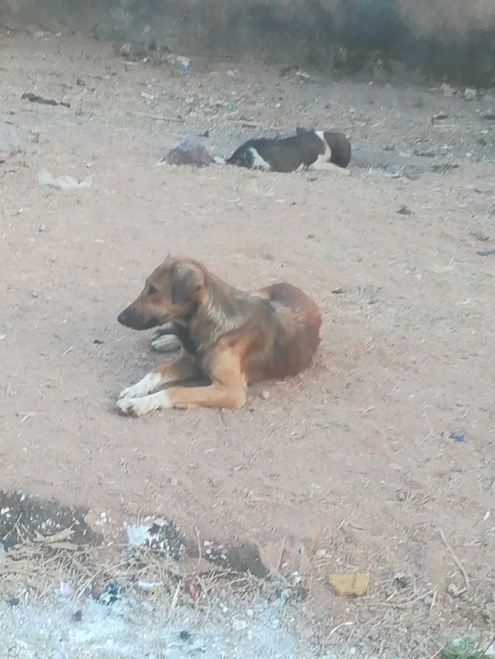 Two dogs rest on a dirt ground. One lies in the background, its black and white coat visible. The other, closer to the foreground, is brown with white markings on its legs. It is sitting with its legs folded beneath it. The ground appears somewhat barren and littered with debris. The overall tone is somber, suggesting a neglected environment.