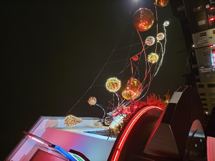 Nighttime view of festive decorations. Illuminated spheres of varying sizes ascend on thin cables. Below, a building roof is visible, adorned with red lighting and decorative reindeer figures. A prominent architectural structure with a red illuminated arch dominates the foreground, juxtaposed against taller buildings in the background.