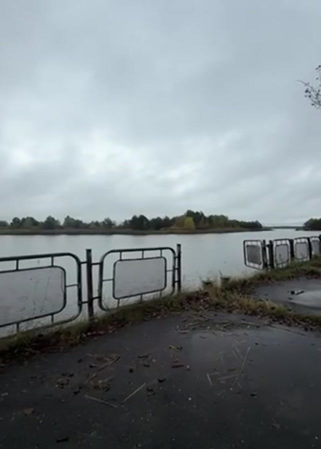 bleak, overcast day at a lakeside location. A broken-down walkway with rusted metal fencing runs along the water's edge. The asphalt surface of the walkway is cracked and filled with puddles. Across the water, there are dense trees and vegetation on the opposite bank. The sky is uniformly gray and cloudy. A bare tree branch is visible in the upper right of the frame.