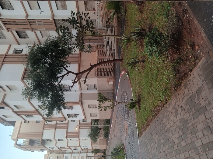 A residential building complex occupies most of the frame, showcasing multiple stories and rows of windows. Green trees and shrubs grow along a pathway lined with grey paving stones. A strip of grass and dirt borders the walkway. The scene is well-lit with natural light.
