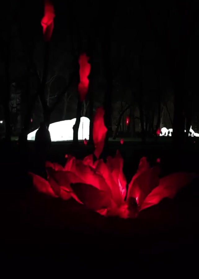 night scene in a park. A large, red illuminated flower is in the foreground, and several smaller, floating red lanterns are above and around it. In the background, there are trees and indistinct figures of people near a bright, white rectangular light source.