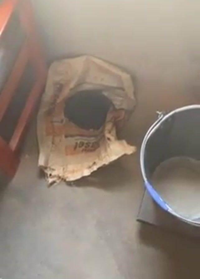 n indoor space. It begins with a view of a partially open paper bag labeled "asel" and a silver bucket on a digital scale. The camera pans to include a red-framed chair and a brown table with papers, a phone, and silverware on it.