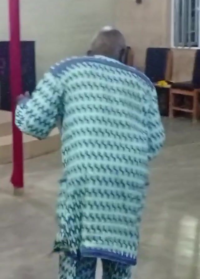 An elderly man in a patterned green and blue suit dances in a large room. The room appears to be a church or meeting hall with rows of empty chairs, a small stage decorated with pink fabric, and a window with bars. A camera is set up on a tripod to the left, and the man’s movements appear somewhat constrained, but he is clearly enjoying himself. The lighting in the room is bright, and the overall impression is one of simple joy in a humble setting.