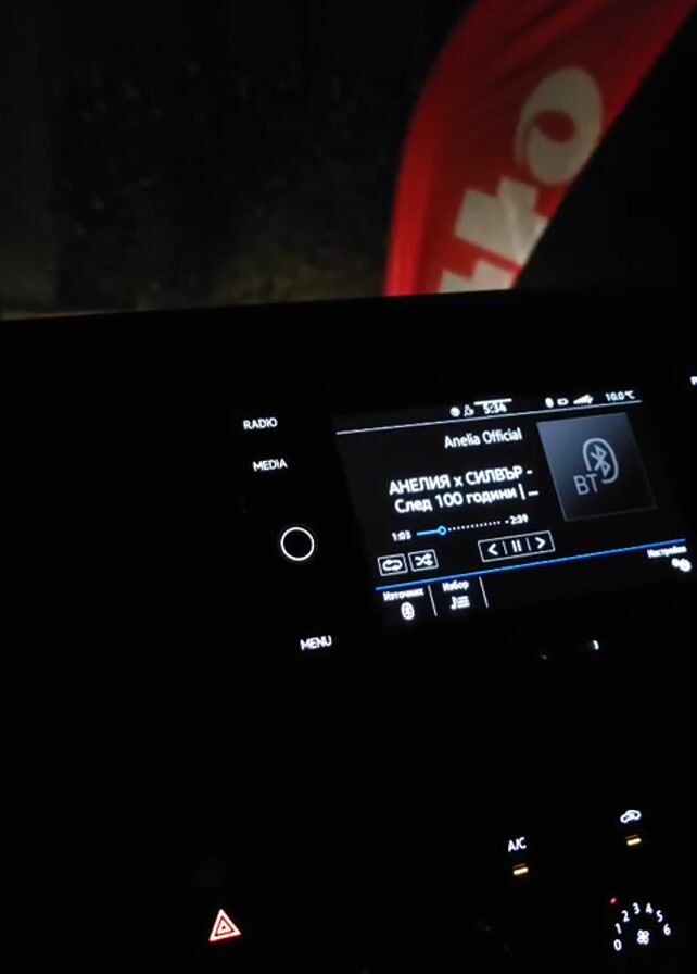 The scene shows a dark interior of a vehicle, likely a car, with the infotainment system illuminated. The screen displays music information, showing the artist "Anelia Official" and the song "след 100 години (Sled 100 godini)," playing via Bluetooth. The hazard lights button is lit, and the A/C and fan controls are also visible. Through the windshield, a blurred red banner with a white logo is partially visible, indicating an external element in the environment. The overall lighting is low, focusing on the dashboard components.