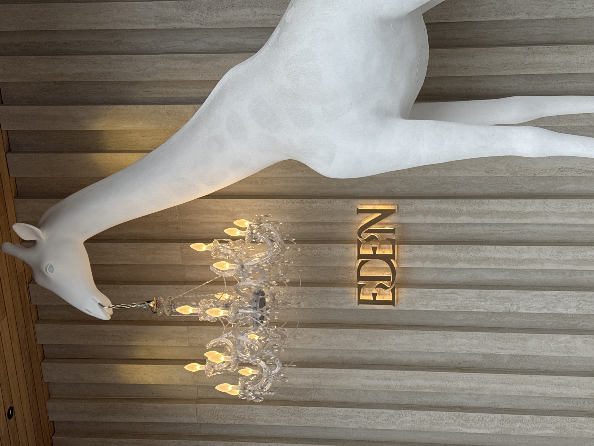 The image depicts an interior scene in Plovdiv, Bulgaria. A large white sculpture of a giraffe, mounted upside down, appears to extend from the ceiling. Its head is positioned above a chandelier, as if it is eating from the fixture. Adjacent to the chandelier is the word "EDEN" in gold, vertically arranged letters, also attached to the ceiling. The background is a textured wall in shades of grey. The left edge of the image shows a wood paneling, suggesting a corner within the space. The scene appears to be a decorative interior within a building, possibly a restaurant or hotel in Plovdiv, showcasing a unique and somewhat surreal design. There are no visible people in the image.