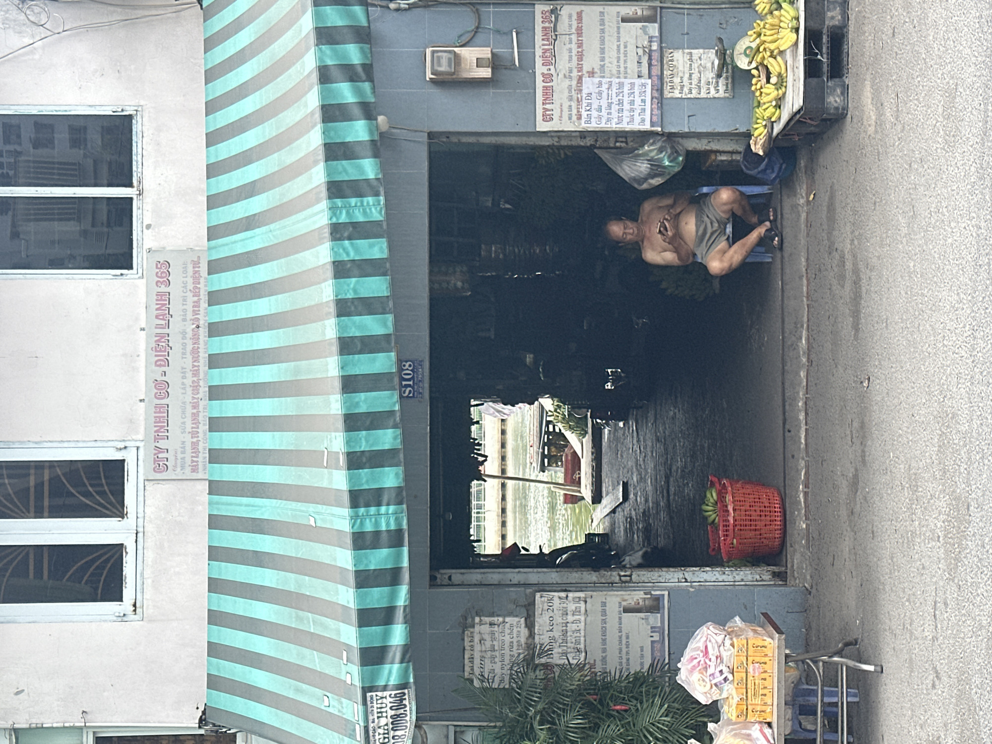The image depicts a street-level commercial storefront in Ho Chi Minh City, Vietnam, opening directly onto a waterway. The building's upper facade is a faded light color with two white-framed windows. A striped awning, featuring alternating teal and dark grey bands, extends over the ground-floor entrance. Above the awning, a sign reads "CTY TNHH CƠ - ĐIỆN LẠNH 365," indicating a mechanical and refrigeration business. A small sign displaying "S108" is centered above the entrance. On the left side of the entrance, a sign for "GIA HUY" with a phone number is partially obscured by a leafy green plant. On the right, a utility box with a meter is mounted on the wall, below which are multiple faded paper signs with Vietnamese text listing various goods and services, including "Bán Khí Đá" (Sell Ice), nylon rope, dish soap, and bleach. The wide, open entrance reveals a dark interior, leading to a visible body of water, likely a canal or river, with a distant concrete barrier and railings on the opposite bank. A wooden plank extends from the shop's interior towards the water. Seated on a light blue plastic stool just inside the entrance, to the viewer's right, is a shirtless adult male wearing dark shorts and sandals. He is looking down intently at a smartphone held in both hands. To his immediate right, on the sidewalk, a large pile of ripe yellow and green bananas is displayed on a black plastic pallet, next to which a scale is partially visible. A black plastic bag hangs on the wall near the man. Further inside the shop, a red plastic basket holds more green bananas. On the sidewalk to the viewer's left, a small, collapsible metal table holds a yellow plastic crate containing various packaged items in clear plastic bags, likely snacks or candies. The street surface is paved, appearing worn and mottled.