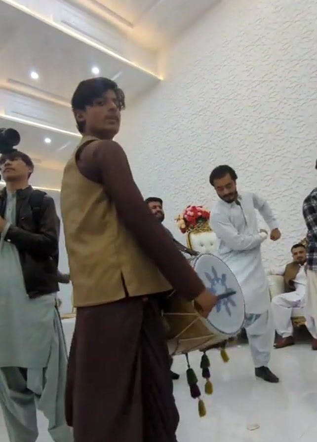 A group of men are dancing in a room, likely during a celebration. One man is playing a daf, a frame drum decorated with blue and purple arrows in a circular pattern, with hanging tassels. He wears a brown shalwar kameez and a tan vest. Other men are dancing along, wearing shalwar kameez in white, gray, and a black and white checkered pattern. Some men are clapping. A man in a black jacket is filming the scene with a camera on a gimbal. The room is decorated with a patterned white wall and a white ceiling with recessed lighting. There is a white and gold chair visible in the background.