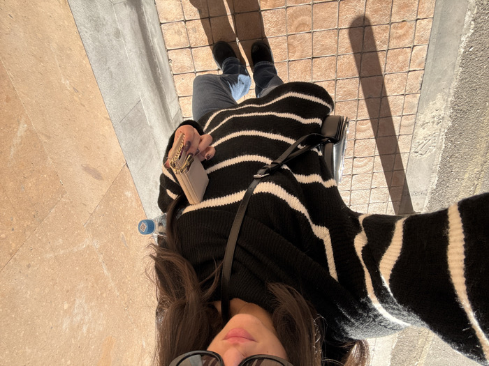 A single individual is depicted in a high-angle outdoor selfie, standing on a paved sidewalk in Yerevan, Armenia. The person, appearing female, is partially visible from the mid-torso upwards, wearing a black knit sweater with thick horizontal white stripes, blue denim jeans, and dark shoes. Large, dark sunglasses obscure the upper portion of the face. A small black crossbody bag with a thin strap is worn over the individual's left shoulder. In the left hand, a light beige or light grey rectangular wallet with a short gold-colored chain is held. The right hand grips a clear plastic water bottle with a blue cap. The environment consists of a sidewalk paved with square reddish-brown tiles. To the left, a grey concrete curb borders a darker, possibly asphalt, surface. To the right, a vertical wall composed of rough-cut, light reddish-brown or pinkish-beige stone, likely volcanic tuff, rises alongside the sidewalk. Strong sunlight casts a long, distinct shadow of the individual onto the tiled ground, extending towards the lower left of the frame. The architectural materials (tuff stone and specific sidewalk tiling) are consistent with public walkways and building facades commonly found throughout the city of Yerevan, Armenia.