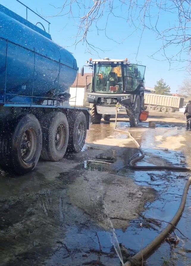 water truck refilling from a hose, with a tractor and a semi-truck visible in the background