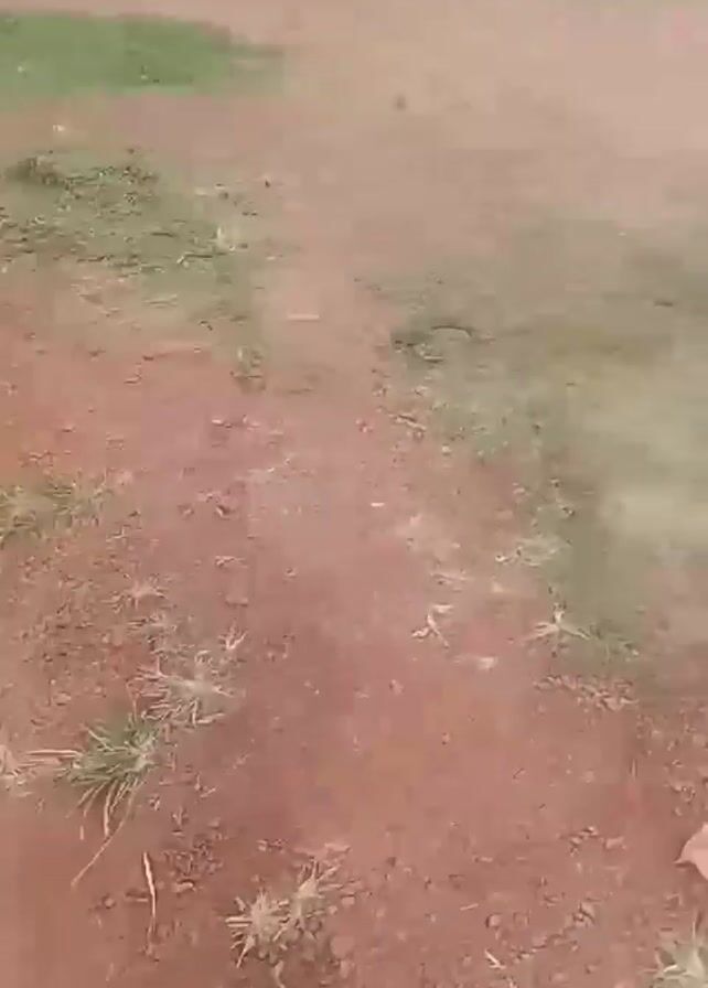 The video depicts a dirt road, bordered by patchy grass, leading through a landscape of buildings and trees. The first building in the frame is a white, single-story structure with multiple windows. A motorcycle drives past this building. As the camera moves forward along the dirt road, a large tree comes into view. Further down the road, there is a brown building with several windows and doors, and a wooden bench is visible near the trees. People can be seen walking around the building. The environment appears to be an outdoor space, potentially a campus or a park. The red-brown dirt road is the primary pathway. The quality of the video is somewhat grainy and the camera movement is unsteady.