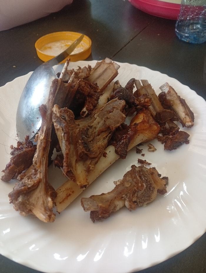 The image displays a close-up view of a dining setting within an undetermined indoor environment, city of Unknown, Unknown. A white, fluted-edge ceramic plate occupies the majority of the frame, laden with approximately 15-20 pieces of cooked animal bones, primarily consisting of rib sections and other fragmented bones, exhibiting residual dark brown meat and rendered fat. A large, silver-colored metal serving spoon rests on the left side of the plate, partially covered by the bone fragments. In the upper left background, an open yellow plastic container holds a white granular substance, likely salt, with a small silver-colored metal knife or spreader resting within it. To the upper right, a translucent plastic bottle containing a blue liquid is visible, alongside a portion of a pink plastic object. The objects are situated on a dark, flat surface, possibly a table, which features a visible seam. A blurred, light-toned object, consistent with a human limb or garment, is partially discernible in the extreme upper left of the image. No active consumption or direct human interaction with the food is depicted, suggesting the scene represents the remnants of a recently consumed meal.