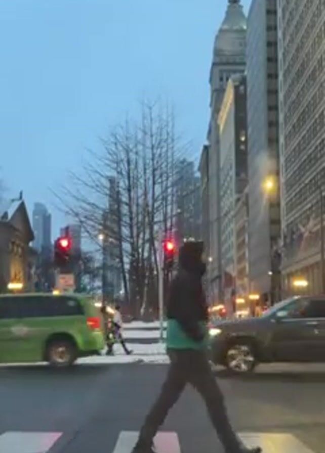 The video depicts a street scene in a city, possibly Chicago, on a cloudy day