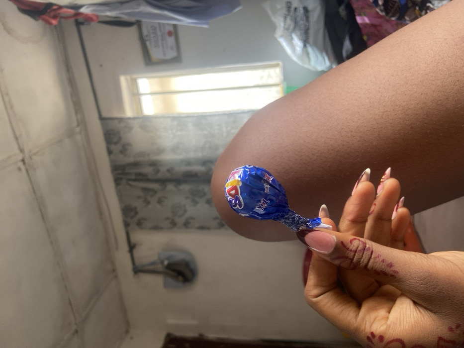 This image depicts an interior room located in Lokoja, Nigeria. The foreground is dominated by a close-up view of a dark-skinned left hand holding a blue-wrapped lollipop labeled "SOFI XL" and "Extra Large." The hand features intricate reddish-brown henna patterns on the thumb and extending to the index finger, and its long, almond-shaped fingernails have white French tips with small colored decorations on some digits. Adjacent to the hand, the bare upper thigh of a dark-skinned individual is visible, displaying skin texture. The background features light-colored walls and a ceiling with visible seams. A window, partially covered by light-patterned curtains, allows bright natural light into the room. To the left of the window, a light-colored bag hangs from a hook on the wall. To the right of the window, a framed certificate is mounted on the wall, beneath which multiple garments hang from a hook or rack. A white plastic bag is present on a surface in the lower right background.