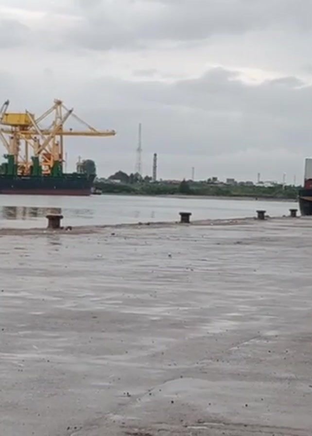 The scene presents a harbor on an overcast day. In the foreground, there's a gray, wet concrete dock. Further back, two ships are visible. The ship on the left is larger, with a yellow crane structure on its deck. The ship on the right is smaller, holding a load of containers. Behind the ships, there's land with vegetation and a few structures, including a tall tower. The sky is gray and cloudy, contributing to the somber tone of the scene.