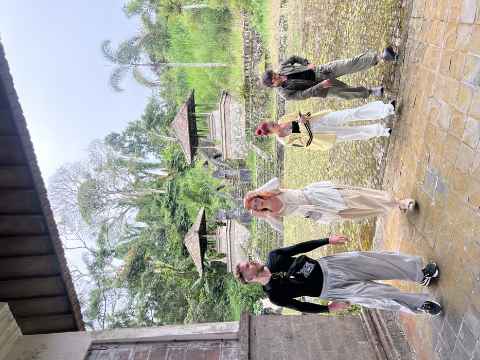 The image displays an outdoor scene in Mekarsari, Indonesia, featuring four individuals on a tiled pathway backed by lush tropical vegetation and traditional structures under an overcast sky. From left to right: 1. A male with short, light brown hair, wearing a black long-sleeved shirt, light grey loose-fitting trousers, and black sneakers. A black fanny pack with a white graphic is slung across his chest, and sunglasses are tucked into his collar. He is oriented towards the right. 2. A female with long, wavy reddish-blonde hair, wearing a white lace long-sleeved top, a layered white and beige skirt, and light-colored open-toed sandals. A metallic silver fanny pack is worn on her front. Her hands are positioned at her hair. 3. A female with bright pink hair, wearing a yellow long-sleeved jacket with black stripes over a black top, white loose-fitting trousers, and white sneakers. She is looking down at a white smartphone held in both hands. 4. A male with short, dark, curly hair, wearing a dark olive-green collared jacket over a black top, dark olive-green loose-fitting trousers, and dark footwear. His right hand rests on his hip, and he is looking towards the right. The foreground consists of a wet, light-colored tiled ground surface. To the left, a portion of a concrete building structure is visible. The top of the frame shows a building overhang. In the midground, behind the individuals, two traditional open-sided gazebos with dark, multi-tiered roofs and decorative base structures flank a set of stone steps that ascend into the background. These steps are partially overgrown with moss and vegetation. The ground between the individuals and the steps is sparse with patchy green growth. The background is dominated by dense, green tropical foliage, including large trees, some with bare branches and orange blossoms, and a tall palm tree on the right. The sky is uniformly grey and overcast.