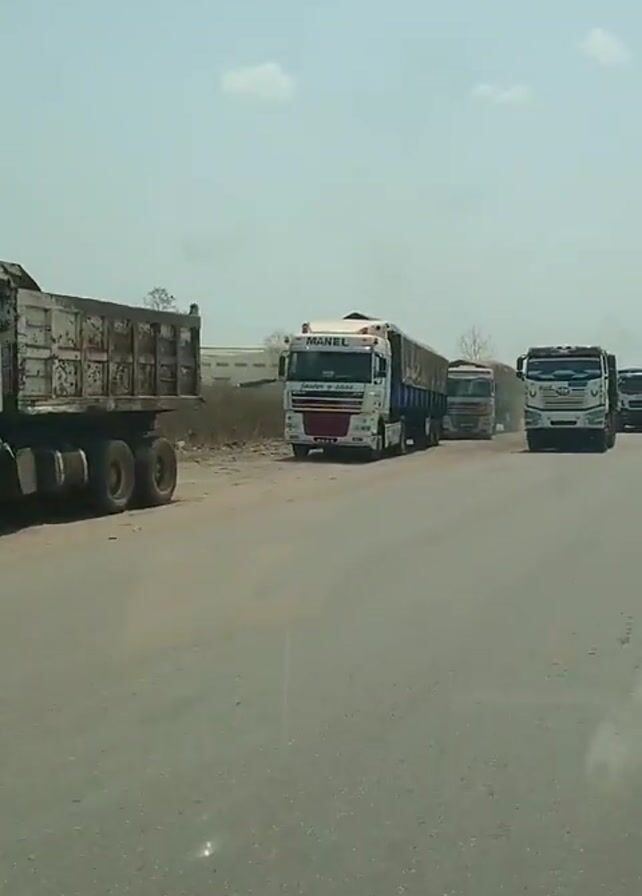 several trucks parked on the side of a paved road under a mostly clear sky. The closest truck, a white dump truck, is parked on the shoulder of the road, and it appears to be somewhat old and worn. Behind it, there are three more trucks; two of them have trailers. All the trucks seem to be facing the same direction. The road appears to be dusty and has some cracks. Beyond the trucks, the landscape is relatively flat with some sparse vegetation visible. The video seems to be taken from inside a moving vehicle.