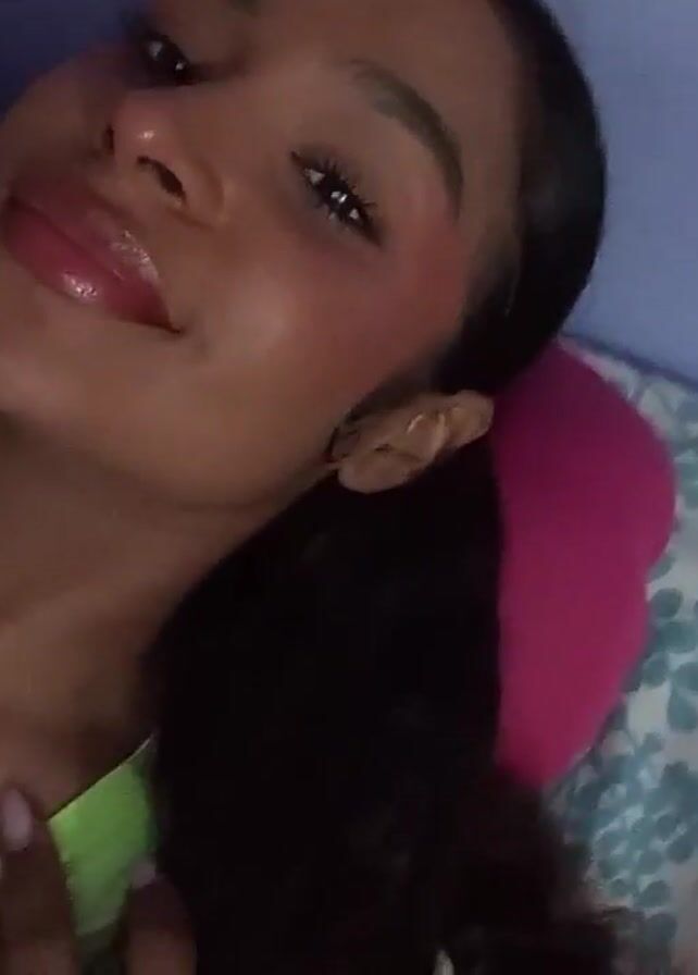 young woman with dark hair, wearing a neon green shirt, lying on a bed with a floral patterned pillow. She purses her lips, sticks out her tongue, smiles, and touches her front teeth with her finger. The wall behind her is a light blue color.
