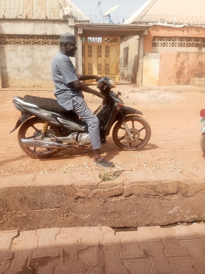 An adult male is seated stationary on a black underbone-style motorcycle on a dirt road in Rigasa, Nigeria