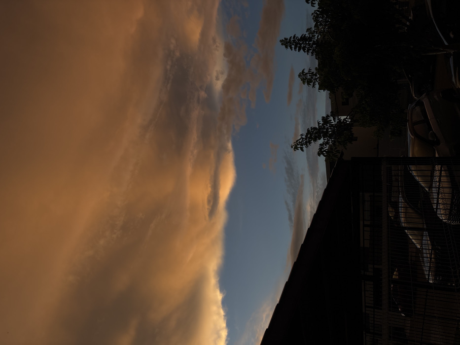 The image depicts an urban or suburban scene in Komchén, Mexico, during what appears to be either sunrise or sunset. The sky, occupying the upper two-thirds of the frame, features layered cloud formations. The uppermost clouds are dense and elongated, illuminated with intense orange and brown hues. Below these, a distinct horizontal band of clear blue sky is visible, with lighter, scattered clouds in similar orange-brown tones appearing beneath it. The lower third of the image is largely in deep shadow. On the left, a dark, angled roof structure, likely part of a building or carport, is prominent. Below this roof, a dark metal fence or gate with a grid pattern is visible. Behind this fence, multiple vehicles, primarily sedans, are partially visible as dark silhouettes with faint light reflections on their surfaces. On the right side of the frame, dark silhouettes of trees and dense foliage are present, obscuring the background. Faint outlines of additional buildings or structures can be discerned behind the trees. No individuals are visible, and no specific actions or interactions are depicted within the static scene.