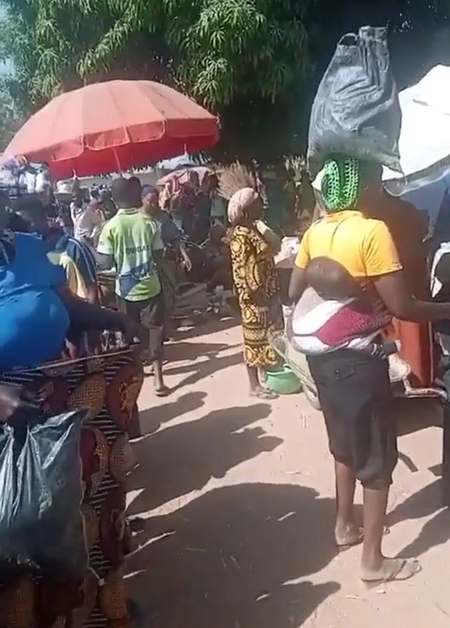 The video depicts a bustling market scene with numerous individuals milling about. Several people are identifiable: A woman wearing a yellow shirt and carrying a baby on her back interacts with a vendor. Another woman, adorned in a blue top and patterned skirt, moves through the crowd. A man in a basketball jersey stands near the vendor. Red and white umbrellas provide shade over the market. The environment appears to be outdoors, possibly a dirt road or open area where the market is set up.