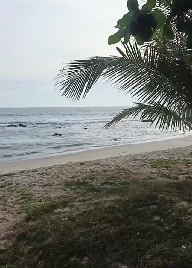 view of a beach. The beach has sand, grass and a tree with large green leaves. The sea is visible with small waves and some rocks in the distance. The sky is cloudy and gray.