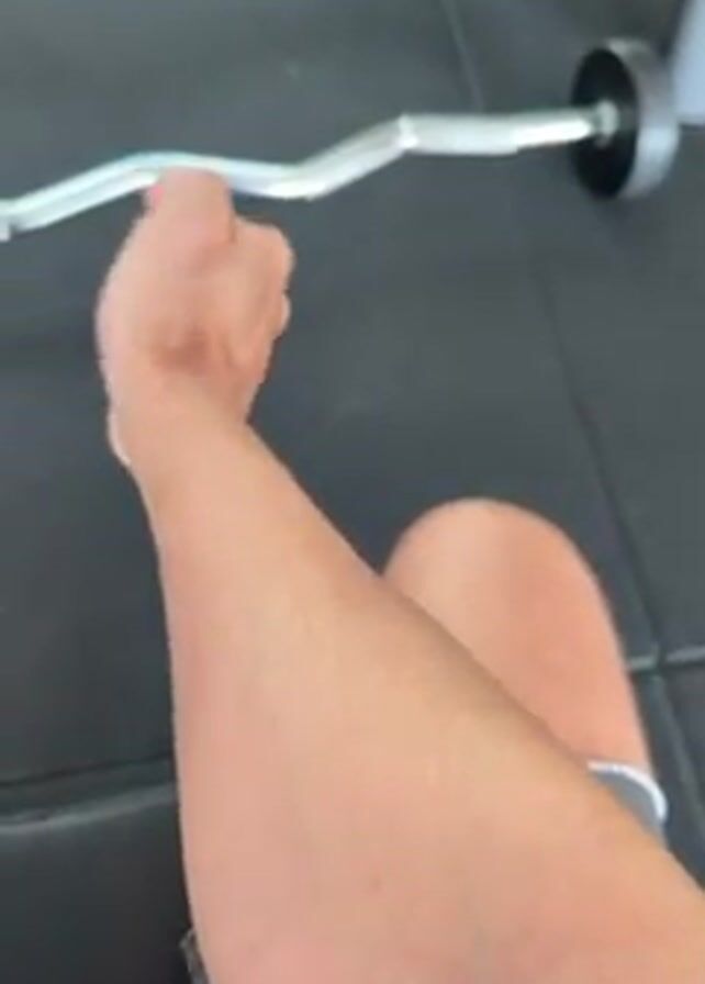 n individual performing wrist curls with a curl bar. The person is seated with their forearm resting on their thigh, gripping the bar with an underhand grip. The camera focuses on the arm as the person repeatedly flexes their wrist, lifting and lowering the bar. The environment appears to be a gym, with a dark gray floor and gym equipment visible in the background.