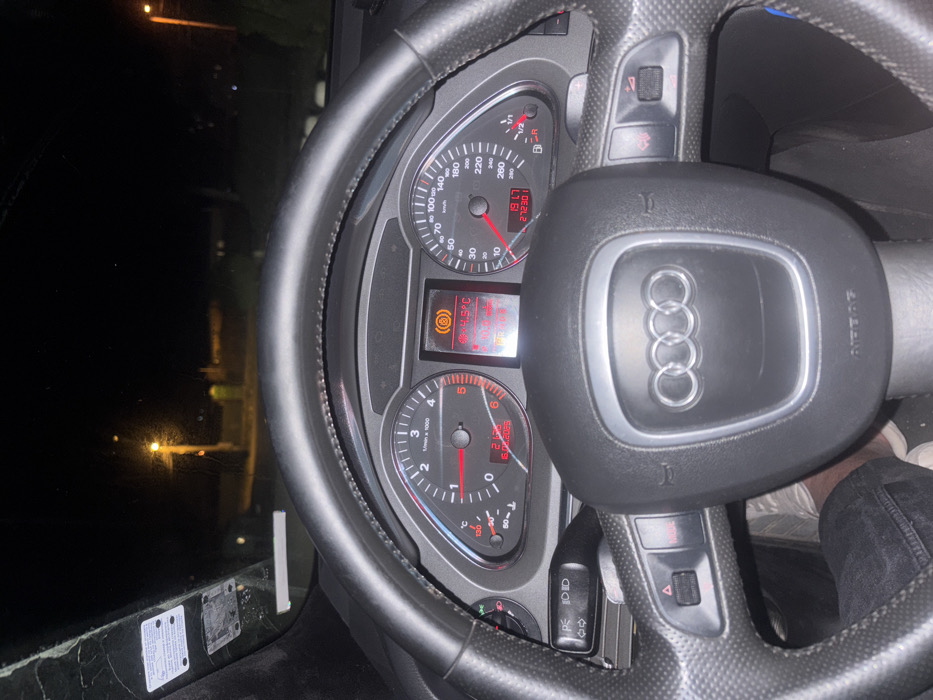 The image depicts the interior of an Audi vehicle at night, specifically from the driver's perspective looking forward through the windshield