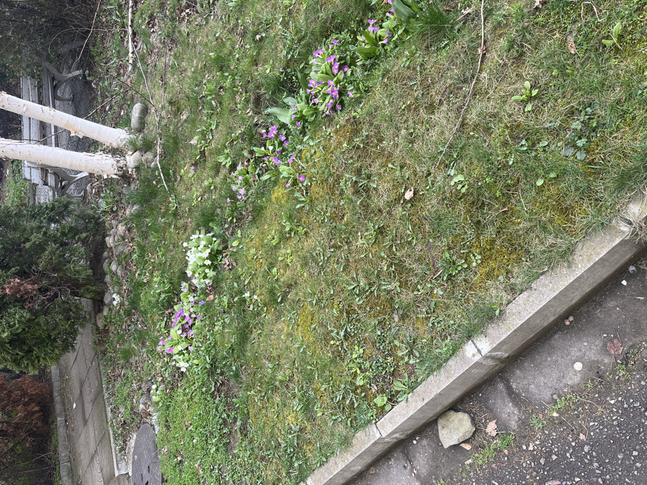 The image presents an outdoor green space, identified as a landscaped area within Sofia, Bulgaria, under ambient daylight conditions. The scene features a patchy lawn bordered by a concrete curb separating it from a paved surface. In the foreground, a gray concrete curb runs horizontally, defining the edge between a dark, coarse aggregate paved area on the left and a mixed grass and moss ground on the right. A single, irregularly shaped light-colored stone is positioned against the curb on the paved side. The midground consists of an uneven grassy terrain, exhibiting varying shades of green and brown, with noticeable patches of moss. Multiple clusters of flowering plants are visible: a prominent grouping of both white and purple primroses is located in the upper-left midground, while several smaller clusters of purple primroses are dispersed across the right-midground. The background to the right reveals two slender trees with distinct white, peeling bark, characteristic of birch trees. Behind them, partially obscured, is a light-colored metal park bench featuring a slatted seat and backrest. To the upper-left background, a dense, dark green evergreen shrub or tree stands adjacent to a gray paved section, which includes a circular metal manhole cover. No individuals, animals, or specific actions are depicted within the frame. The overall impression is that of an urban park or garden setting in early spring.