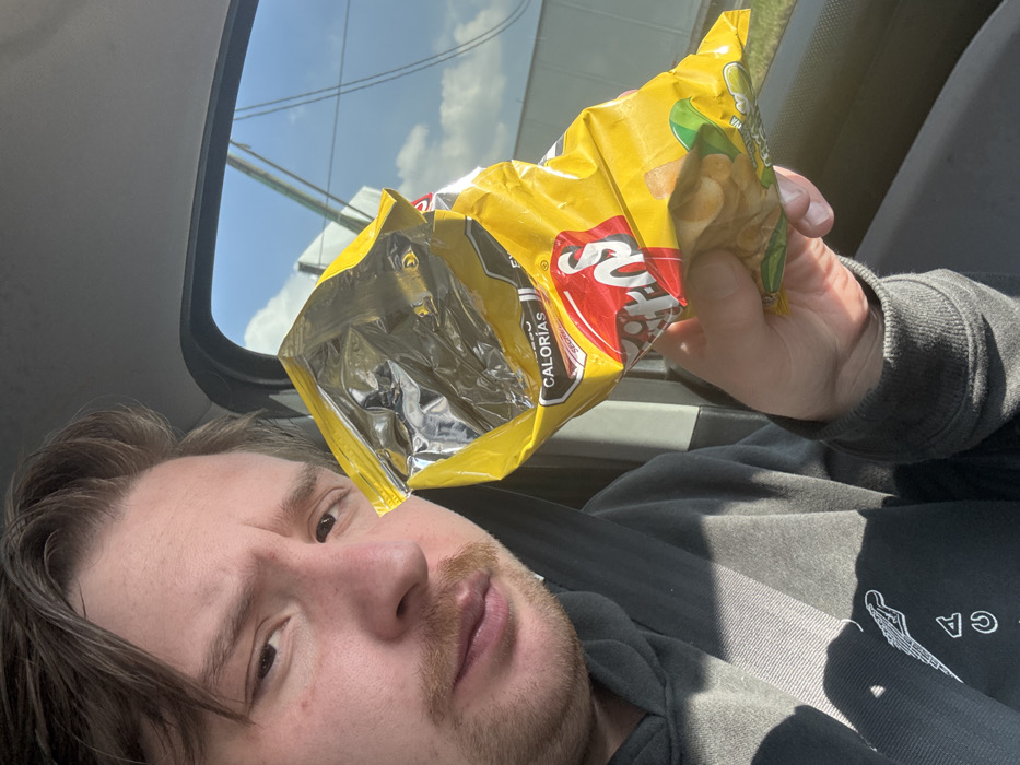 A man is holding a yellow bag of Ruffles Queso potato chips, mostly empty, in a car