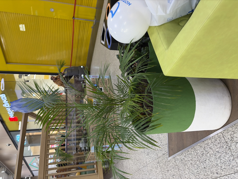 The image depicts an indoor common area within a commercial complex, identified as being in Kudrovo, Russia. In the foreground, a potted palm plant with vibrant green fronds stands within a cylindrical planter, painted dark green on its upper half and white on its lower half. To the right of the plant, a section of a lime-green upholstered chair or modular seating unit is visible, next to which a white balloon with blue Cyrillic text (partially visible, resembling "КОТ") and a white plastic bag rest on the floor. The floor is a light-colored speckled tile, with a dark brown strip running underneath the planter and seating. In the midground, behind the plant, a light-colored wooden fence or railing, possibly part of a children's play area, is present. Behind this structure, a miniature cityscape display is visible. The background on the left features a glass storefront with red lettering that spells "КОТИКИ" (KOTIKI), indicating a retail establishment. On the right background, a large, corrugated yellow roll-down security shutter covers another storefront, marked with several horizontal red lines. A person in a brown jacket is partially visible in the mid-background, seated on or operating a dark-colored ride-on vehicle, possibly a small train, situated near the yellow shutter. Overhead, ceiling lights are visible.
