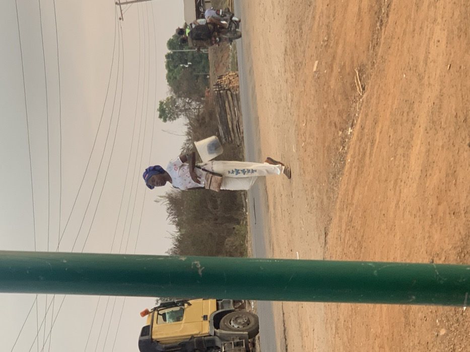 An elderly woman carries a bucket and small bag, walking along a road next to some brush and a truck. She wears a patterned shirt and pants. A blue head wrap covers her hair. A motorcycle passes in the background. Power lines extend across the sky. The image is slightly blurred and the lighting is subdued, creating a hazy, sun-drenched atmosphere. A large green pole appears in the foreground.