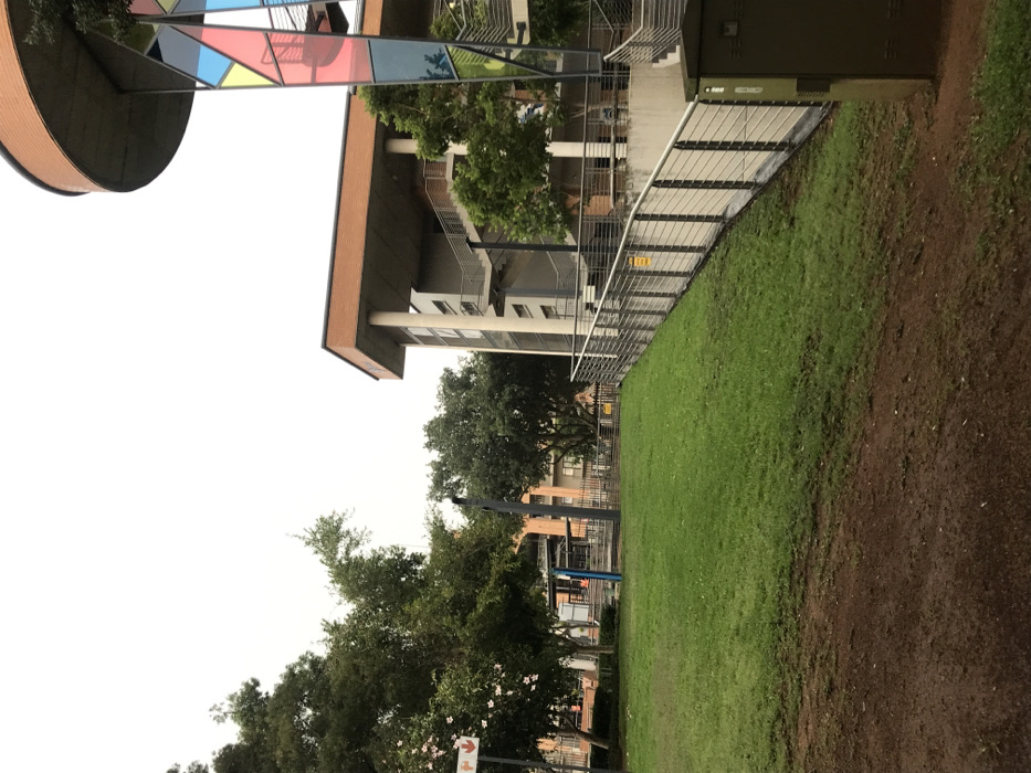 This image captures an outdoor scene in Midrand, South Africa, depicting a modern architectural environment with landscaped green spaces under an overcast sky. In the foreground, the lower third of the frame consists of exposed reddish-brown earth, transitioning into a sloped, well-maintained green lawn that occupies the central and left portions of the midground. A dark green utility box is partially visible in the bottom right corner. A prominent feature in the midground is a sloped, horizontal metal railing, likely stainless steel, running from the right towards the center-left. Several small, rectangular yellow warning signs are affixed to this railing. This railing demarcates a change in elevation, bordering a lower paved area or walkway. Behind and to the right of this railing, a multi-story building with light-colored walls and numerous external staircases featuring similar metal railings is visible. To the left of the grassy slope, amidst dense green trees, a white sign with orange directional arrows (one pointing left, one pointing down) is affixed to a pole. A dark vertical pole and a partial blue structure are also discernable through the foliage in this area. The background is dominated by modern buildings. On the far right, a distinctive multi-story structure features a circular top section with a reddish-brown brick facade. Below this, an external staircase is integrated with a tall, vertical art installation composed of colorful, translucent geometric panels in red, blue, yellow, and green hues. Further back, additional contemporary buildings with similar design elements are partially obscured by trees. No individuals are present in the scene, and there are no discernible actions or interactions.