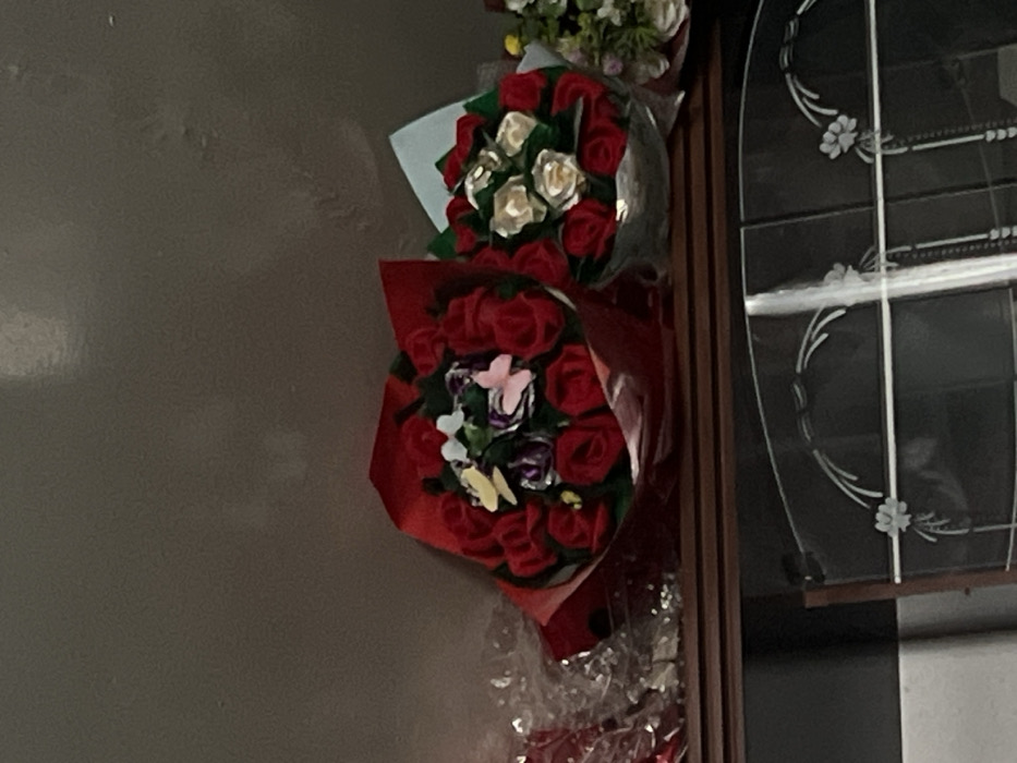 The image displays an indoor scene located in the city of Anoyi, Uzbekistan. No individuals are present. The primary subjects are three artificial flower bouquets arranged on a dark brown wooden shelf. To the far left, a portion of an item wrapped in clear plastic is visible. The central bouquet, wrapped in red material, consists predominantly of red artificial roses, with accentuating white, yellow, and purple artificial flowers and two butterfly ornaments, one yellow and one pinkish-white, in its center. To its right, a second bouquet features red and white artificial roses, presented in a light blue-green and silver-colored wrap. A third, partially visible bouquet containing mixed light-colored artificial flowers is situated to the far right. Below the shelf, a dark brown wooden cabinet with a clear glass panel, decorated with etched floral and arched patterns, is visible. The background is a plain, light brown wall exhibiting subtle textural variations.